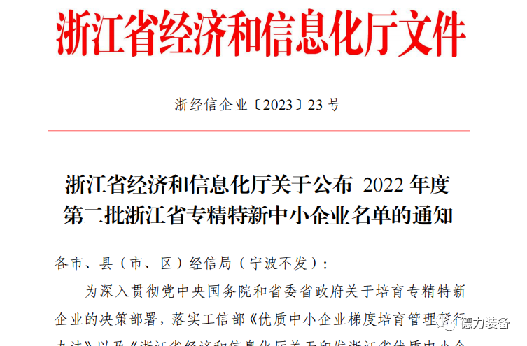 近日,浙江省經(jīng)濟和信息化廳公布2022年度第二批浙江省專精特新中小企業(yè)名單,浙江德力裝備有限公司經(jīng)過市區(qū)推薦、第三方審核等程序,成功獲評2022年度浙江省“專精特新”中小企業(yè)。 德力裝備本次成功認(rèn)定,是對公司近年來在專業(yè)性、特色性、創(chuàng)新能力成長的認(rèn)可,是對公司在細(xì)分領(lǐng)域內(nèi)具備領(lǐng)先優(yōu)勢的肯定。 未來,德力裝備將堅持“專精特新”發(fā)展,持續(xù)做好創(chuàng)新創(chuàng)效工作,賦能企業(yè)高質(zhì)量發(fā)展,為廣大客戶提供更高品質(zhì)的產(chǎn)品和更專業(yè)的服務(wù)。