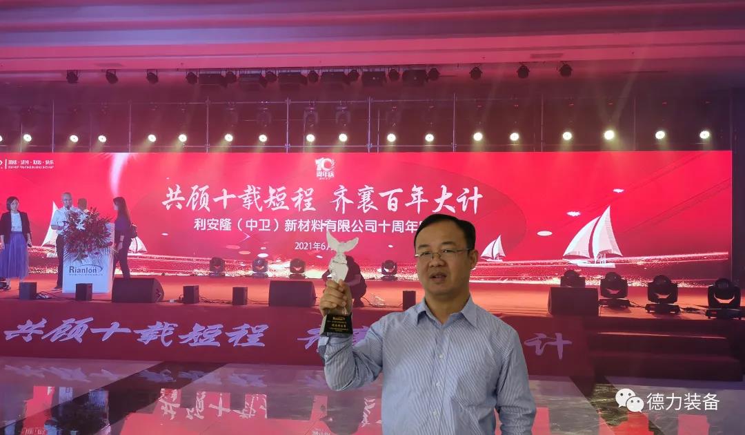 2021年6月16日,公司總經(jīng)理周彬老師和業(yè)務(wù)經(jīng)理潘賢軍老師應(yīng)邀參加利安?。ㄖ行l(wèi))新材料有限公司十周年慶典。 受邀參加本次慶典的是利安隆集團(tuán)從自全球三千六百多家用戶、供應(yīng)商和合作伙伴中精選出來的五十家供應(yīng)商代表和五十家用戶、合作伙伴代表共一百家企業(yè)參加。浙江德力裝備有限公司作為唯一受邀的非標(biāo)壓力容器生產(chǎn)企業(yè)列席本次活動(dòng),并在大會(huì)上授予利安隆“優(yōu)秀供應(yīng)商”稱號(hào)(僅6家企業(yè)獲得此榮)。 利安隆董事長李海平老師說:一個(gè)優(yōu)秀的企業(yè)必須要有一批優(yōu)秀的供應(yīng)商來支撐,我們非常珍惜這些優(yōu)質(zhì)供應(yīng)商資源,我們要與你們建立戰(zhàn)略合作伙伴關(guān)系。 利安隆運(yùn)營副總裁韓伯睿老師說:利安隆與德力的合作關(guān)系已持續(xù)十余年,利安隆天津、寧夏、浙江、廣東、河北和錦州六大生產(chǎn)基地都有德力的產(chǎn)品,我們對(duì)德力產(chǎn)品的質(zhì)量、價(jià)格和服務(wù)都非常滿意。 利安隆中衛(wèi)基地總經(jīng)理熊昌武老師說:中衛(wèi)基地絕大部分核心設(shè)備都來自德力,德力能保質(zhì)保量按時(shí)交付,就是對(duì)中衛(wèi)項(xiàng)目建設(shè)最大的支持。 公司總經(jīng)理周彬老師表態(tài)說:新和成和利安隆都創(chuàng)辦于1988年,都由校辦企業(yè)轉(zhuǎn)制而來,內(nèi)部都推崇老師文化,所以雙方有著天然的親近感和信任感。和利安隆一起合作的十多年里,雙方溝通非常順暢,合作也非常愉快。非常感謝利安隆對(duì)德力的信任與肯定,也非常真切地希望雙方能結(jié)成戰(zhàn)略合作伙伴關(guān)系。未來德力會(huì)不斷努力提升自己,為利安隆提供更好的產(chǎn)品和服務(wù),為百年利安隆建設(shè)盡綿薄之力。
